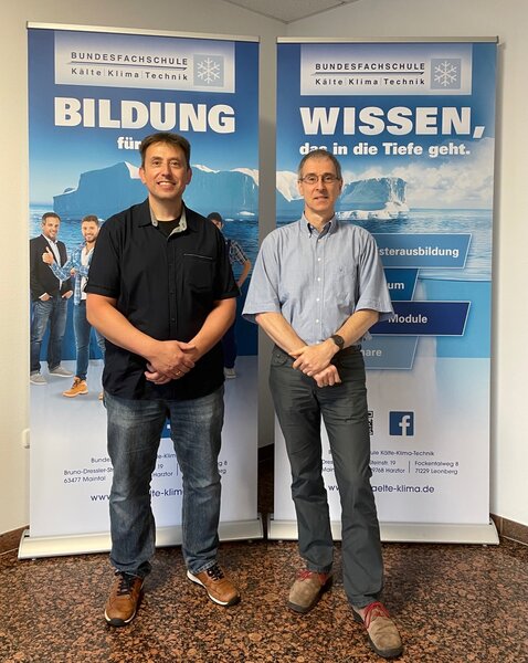 Am 1. September 2021 hat Thomas Emig (im Bild links) die Schulleitung der Bundesfachschule Kälte-Klima-Technik in Maintal von Dr. Ralf Catanescu übernommen. Thomas Emig ist schon lange Dozent an der BFS in Maintal und verantwortet den Fachbereich Elektro- und MSR-Technik. Dr. Ralf Catanescu wird uns im Rahmen seiner Altersteilzeit weiterhin als Dozent an der BFS und ESaK mit seinem Wissen und seiner Erfahrung zur Verfügung stehen.